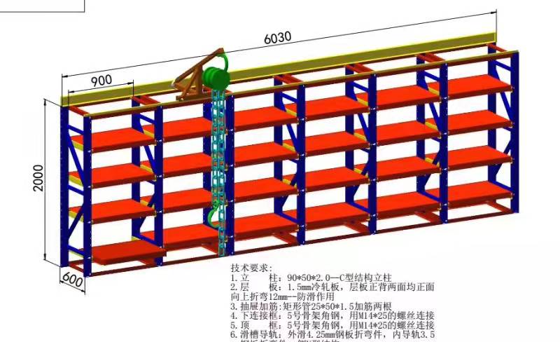 模具货架又称模具架或抽屉式货架,主要存放各种模具物品,根据层载能力要求分为轻型模具货架和重型模具货架。货架顶部可配置移动葫芦车,以方便模具的起吊。